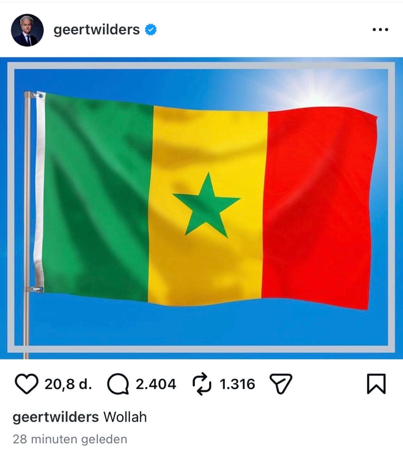 En toen gebeurde er iets dat niets met voetbal te maken had. Geert Wilders plaatste een afbeelding van de Senegalese vlag. Daaronder één woord: wollah. Officieel is het wallah. Arabisch. Letterlijk: bij Allah. Een eed. Een bevestiging. In Nederland verworden tot straattaal, vaak gebruikt om mensen te reduceren tot accent, houding en afkomst. En Wilders weet dit. Dit was geen slordigheid, geen grap, geen onschuldige woordkeuze. Dit was berekend.